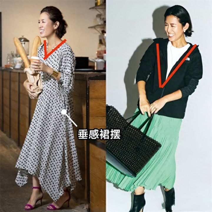 无论是裤装还是裙子,在面料上都要强调垂坠感,例如雪纺、丝绸、优质棉、针织、羊绒、西装料等等,都可以用于长裤、长裙当中,通过自带的垂感,纵向拉长身形线条更显高,领口呈现出V型状态,视觉上更显脖子长。