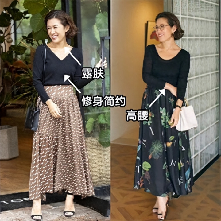 上衣和下装的挑选,需求是不一样的,上衣要适当的露出肌肤线条,选择V领、圆领或者方领,增加颈部露肤面积,气质更成熟,而裤装、裙子则要强调高腰线设计,腰线位置贴合度高,才能勾勒出曲线美。