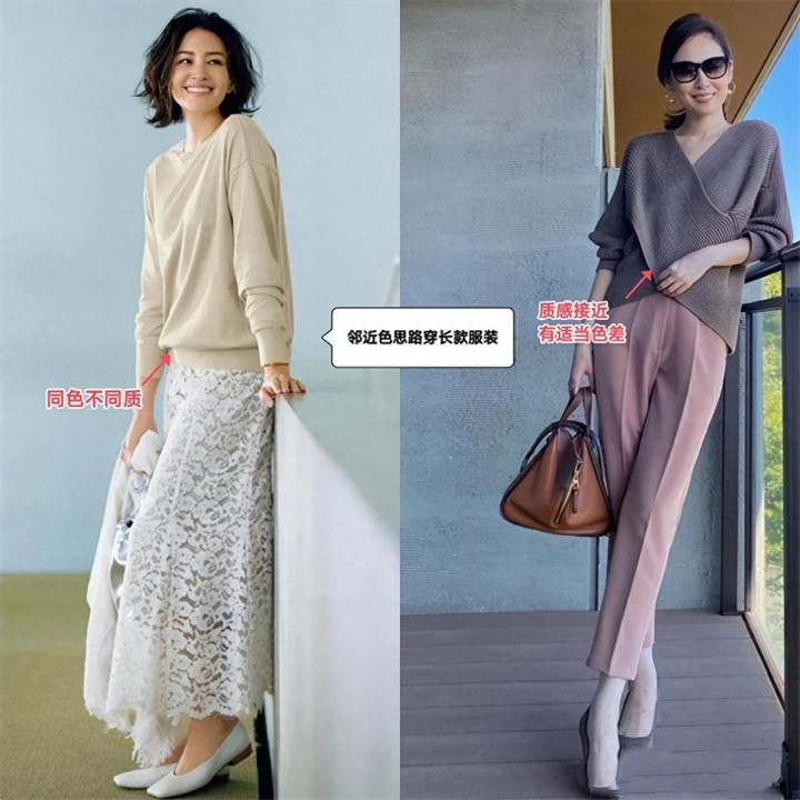 会穿的女人,往往都懂得突出“对比感”,尤其是同色系的搭配,学会运用不同的材质,层次感更分明,如果上衣和下装质感接近,就要有适当的色差,例如明暗对比、深浅结合等等。