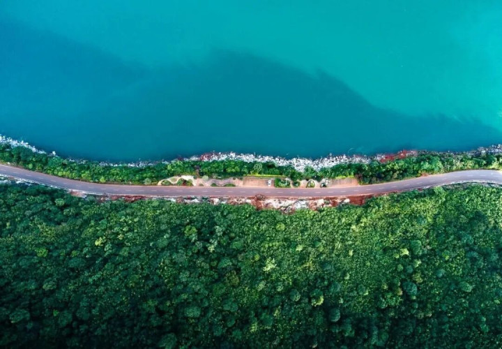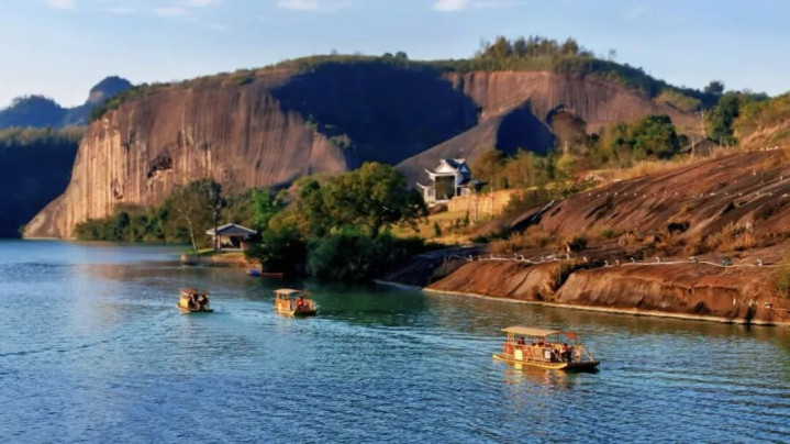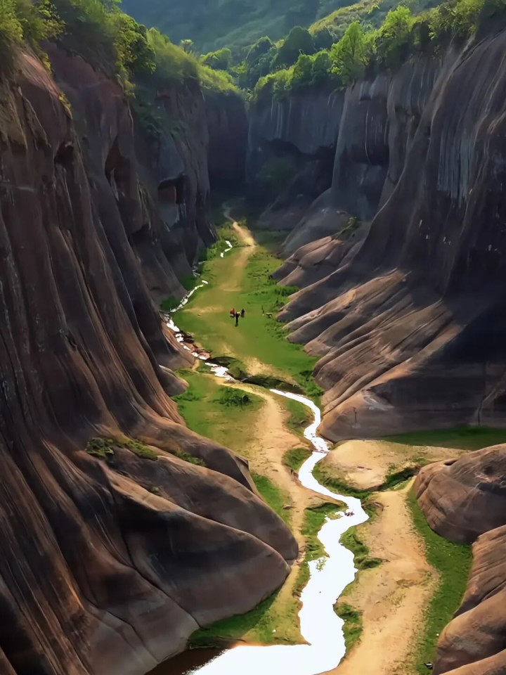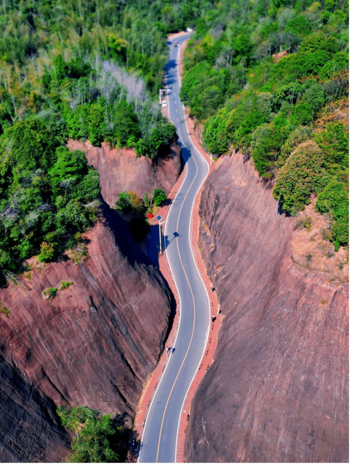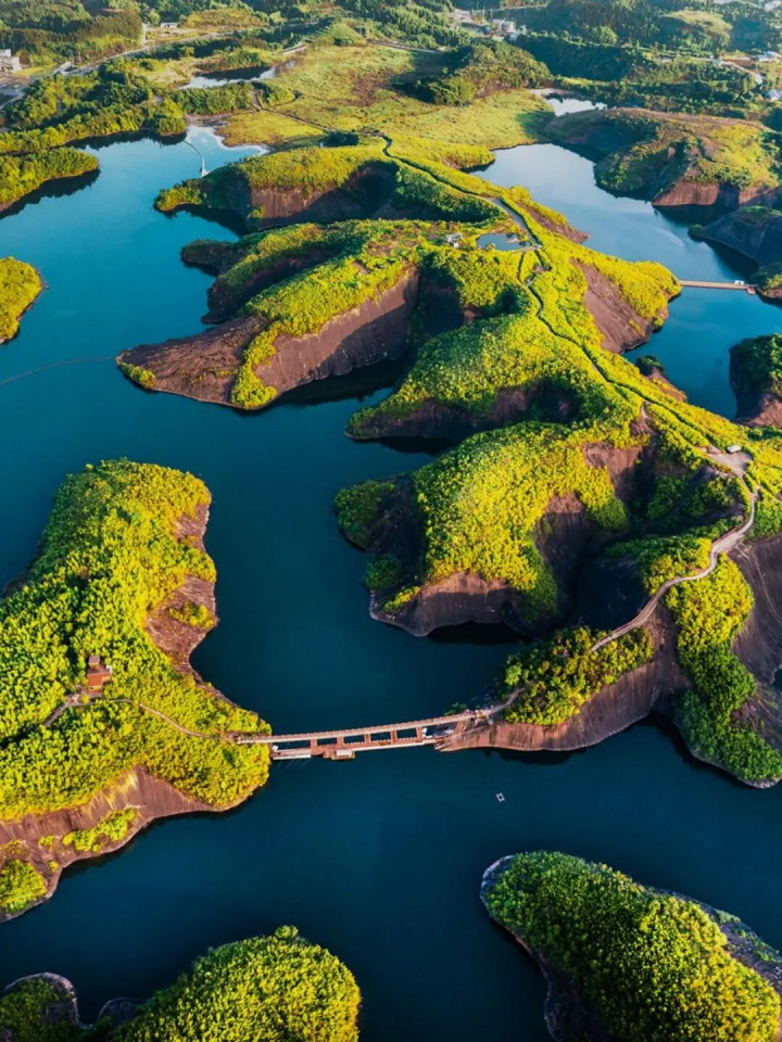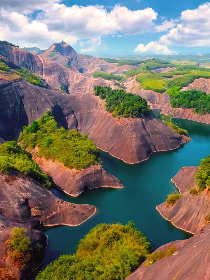 俯瞰碧水在赤红山岩间蜿蜒流淌