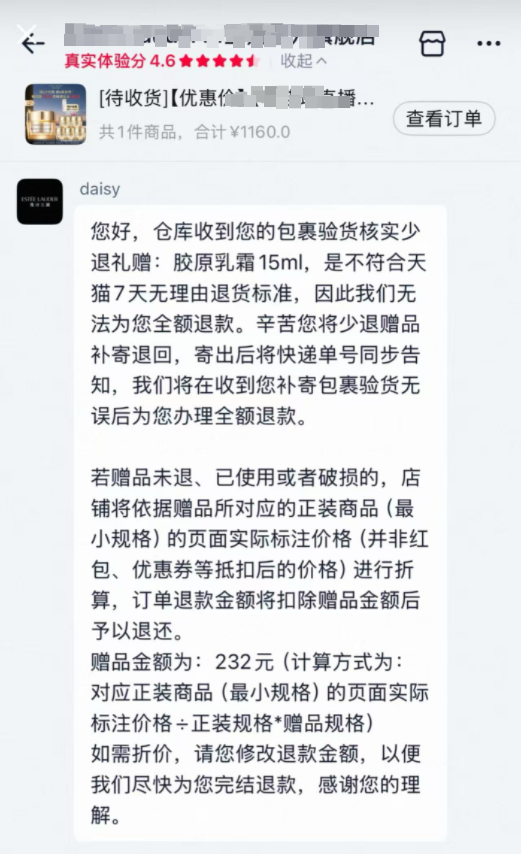 10月30日,谢女士向封面新闻反映,她在网上“雅诗兰黛官方旗舰店”申请退货时,被商家以“赠品缺失”为由,要求从退款中扣除232元。